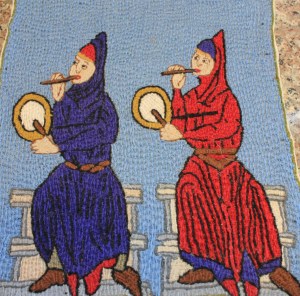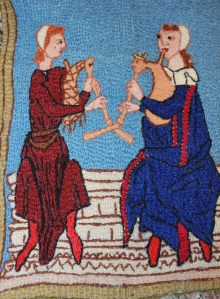 This patch was finished on February 13, 2021. It is an image from the 13th century manuscript, Book of Games, and shows a musicians playing the lute while two people play chess. Laid work embroidery by Julie Carmen. Image by Marc Wiley.