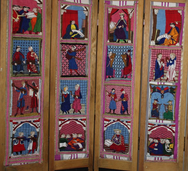 Here is a picture of the medieval screen with some of the Laidwork patches sewn on.